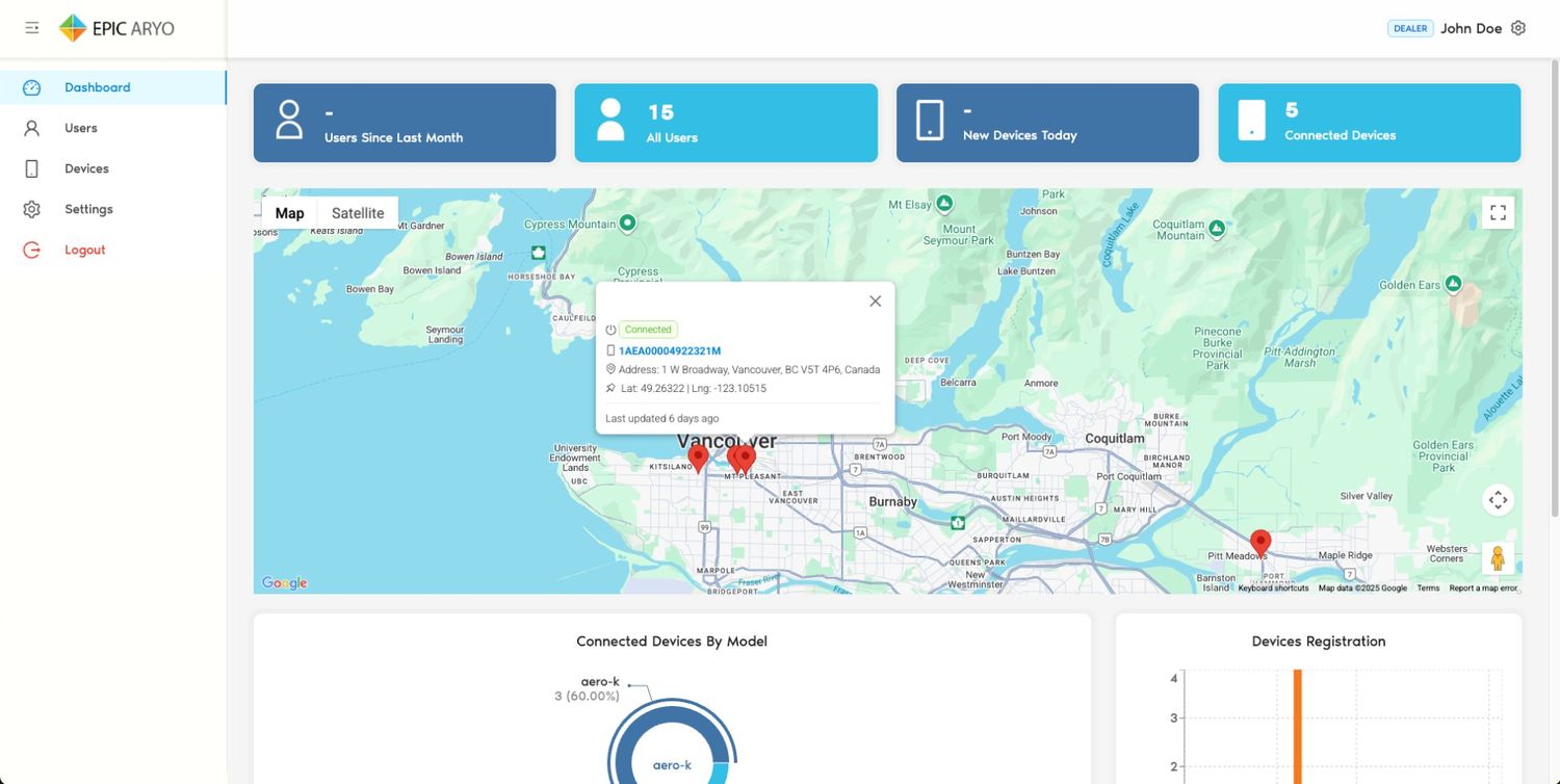 Aryo Cloud delivers complete global visibility, mapping, and control of all connected systems across multiple locations. Through a single intuitive platform, users can monitor real time performance, view system health, and identify trends or risks as they develop. Interactive maps and dashboards provide instant access to site status, alerts, and service history. This unified view empowers teams to act faster, coordinate maintenance more efficiently, and make informed decisions that enhance safety, reliability, and operational continuity worldwide.