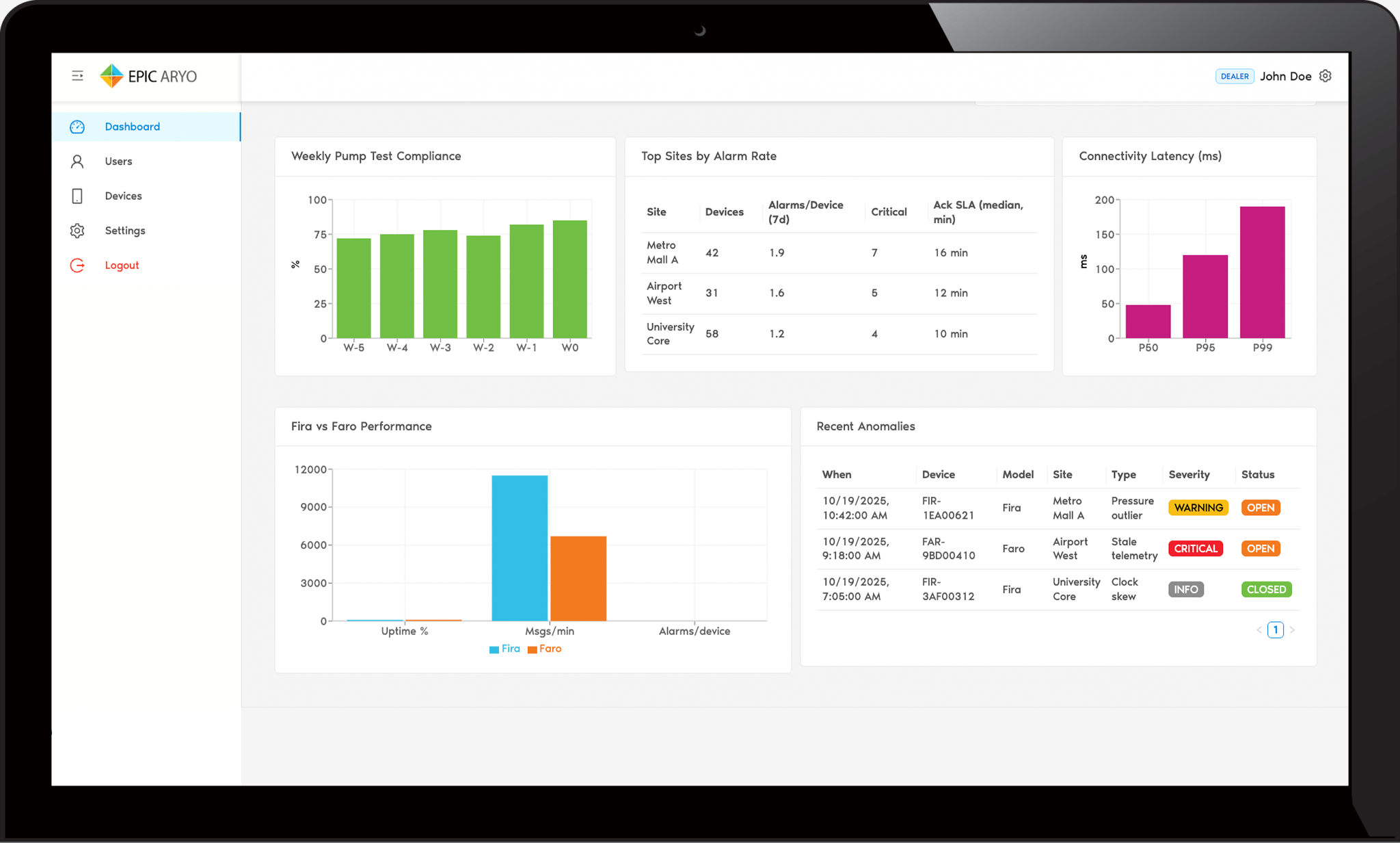 Epic Safety’s Cora, Rivo, Fira, Faro, and Orex devices work together with the Aryo Cloud platform to build a fully connected fire and life safety ecosystem. Certified fire alarm communicators link directly with fire control systems, providing continuous cloud connectivity, real time visibility, and secure data sharing.
